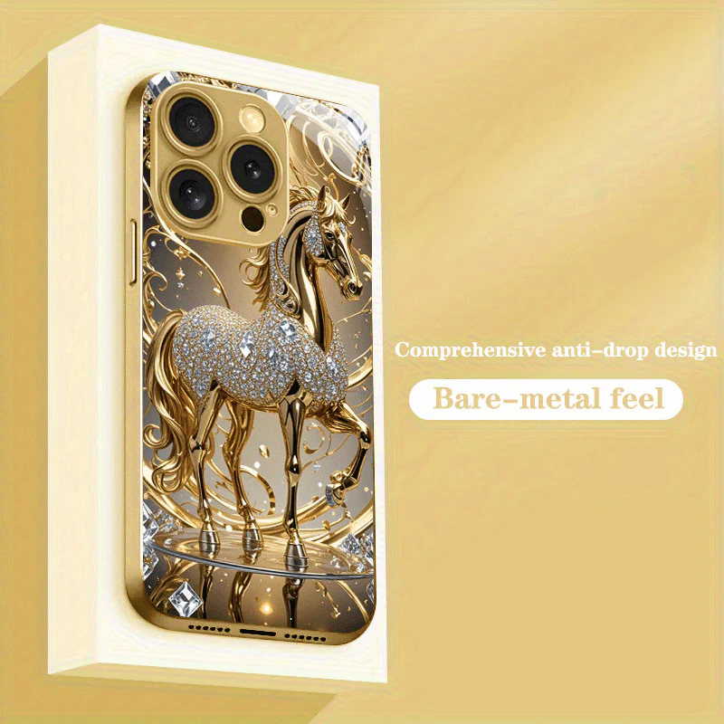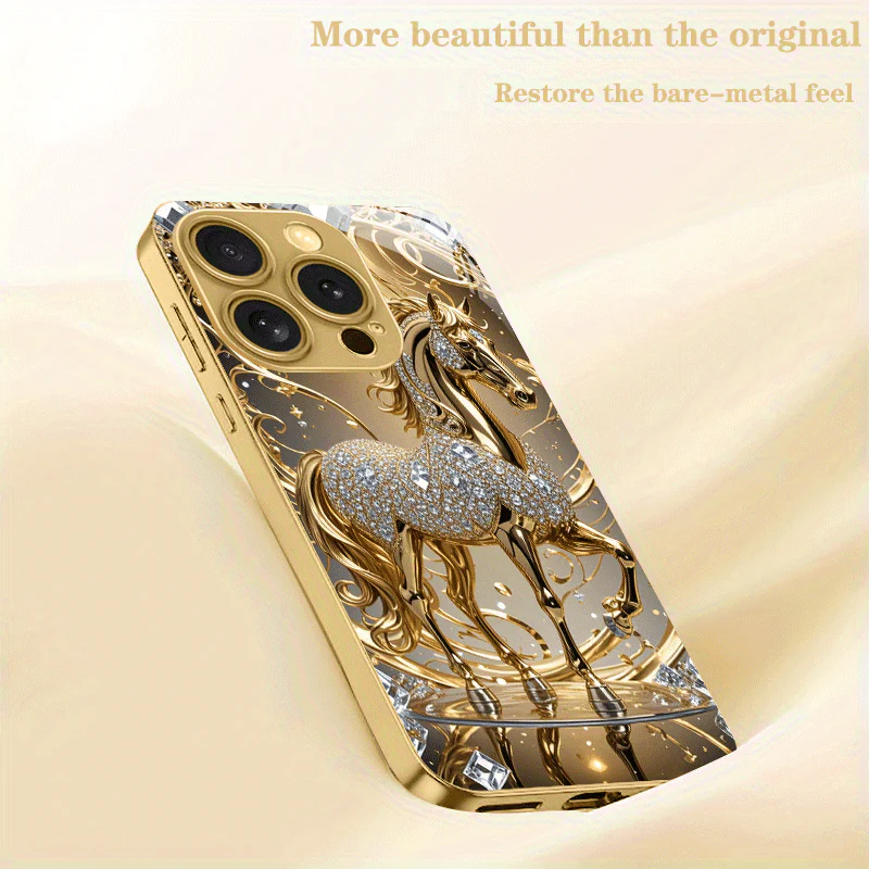 Coque de téléphone de luxe premium en verre avec motif cheval doré
