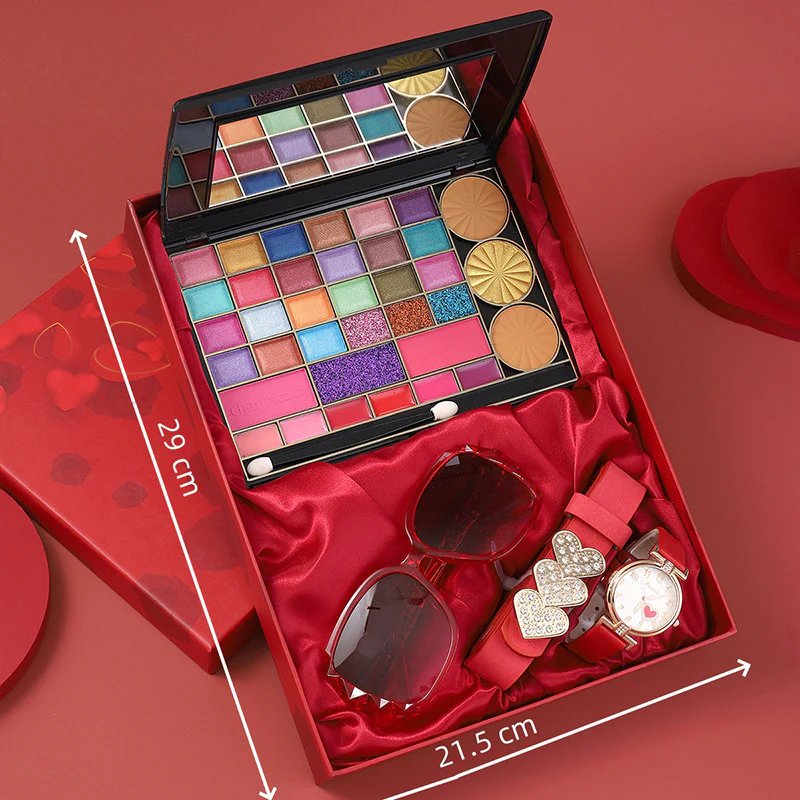 Couleurs : Coffret 4 pièces (palettes à paupières, bracelet, palette de maquillage, teintes naturelles), Coffret 5 pièces (palettes à paupières, blush, palette de maquillage ultra-brillante, lunettes de soleil, bracelet, coffret cadeau), Coffret 5 pièces (palettes à paupières multicolores, blush, ciseaux à ongles, montre, coffret cadeau), Coffret 4 pièces (blush, montre, bracelet, coffret cadeau).