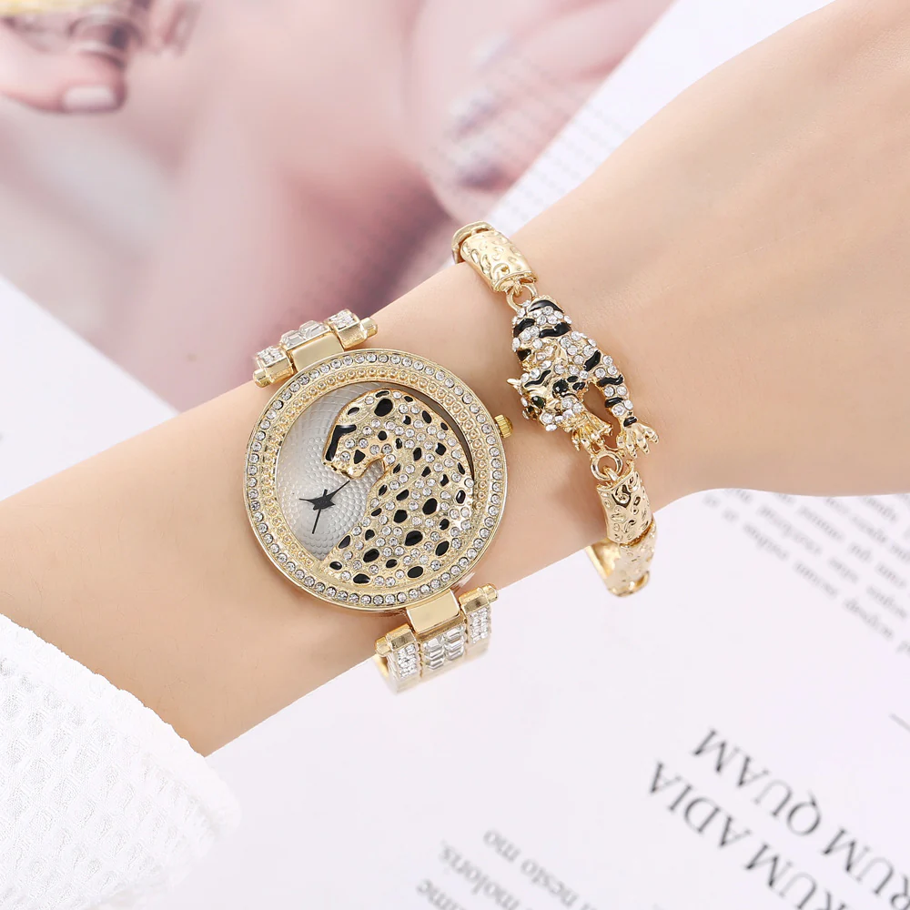 Montre à quartz de qualité, ornée d’un diamant et d’un animal, avec un grand cadran simple et un bracelet en acier.