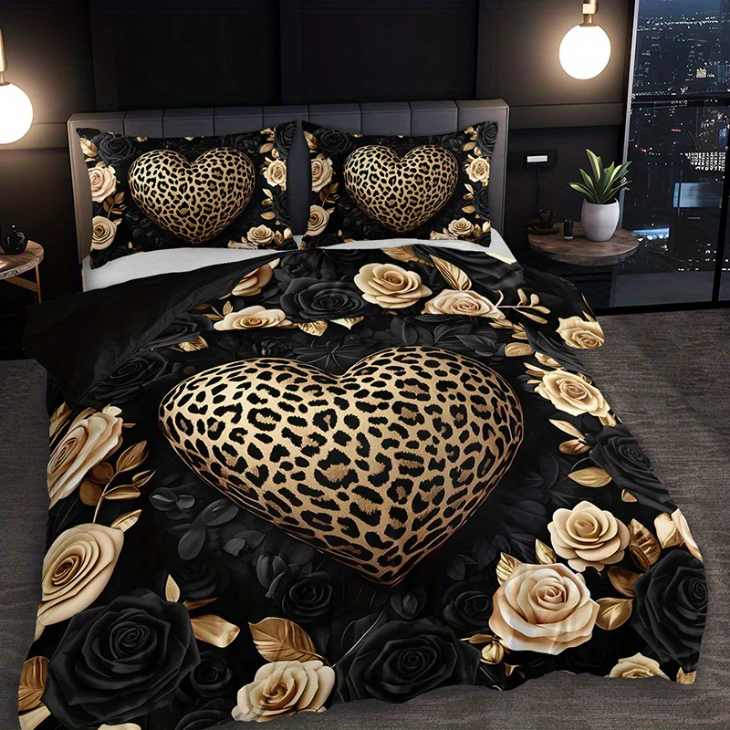 Parure de lit 3 pièces à imprimé léopard et roses (1 housse de couette + 2 taies d’oreiller, sans garniture), style rétro romantique luxueux, impression haute définition