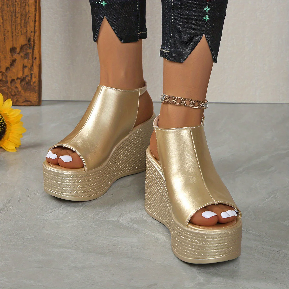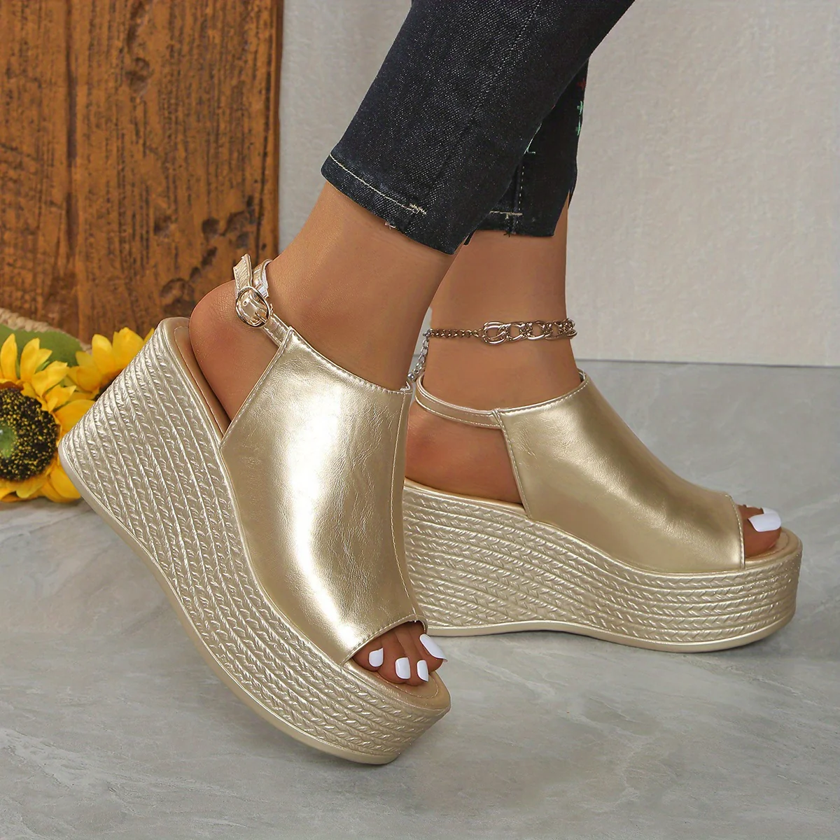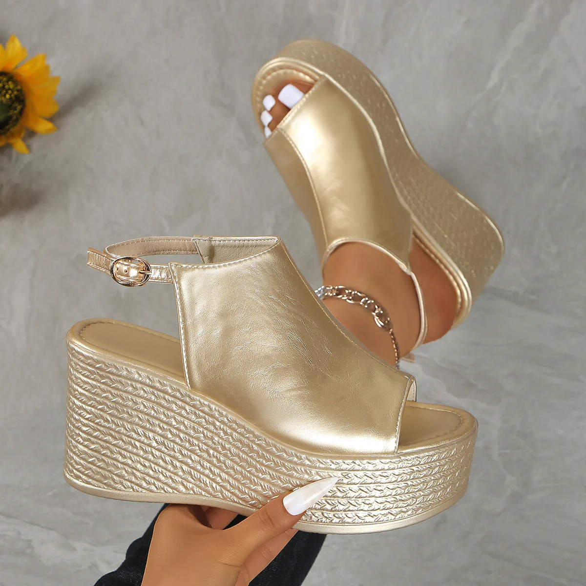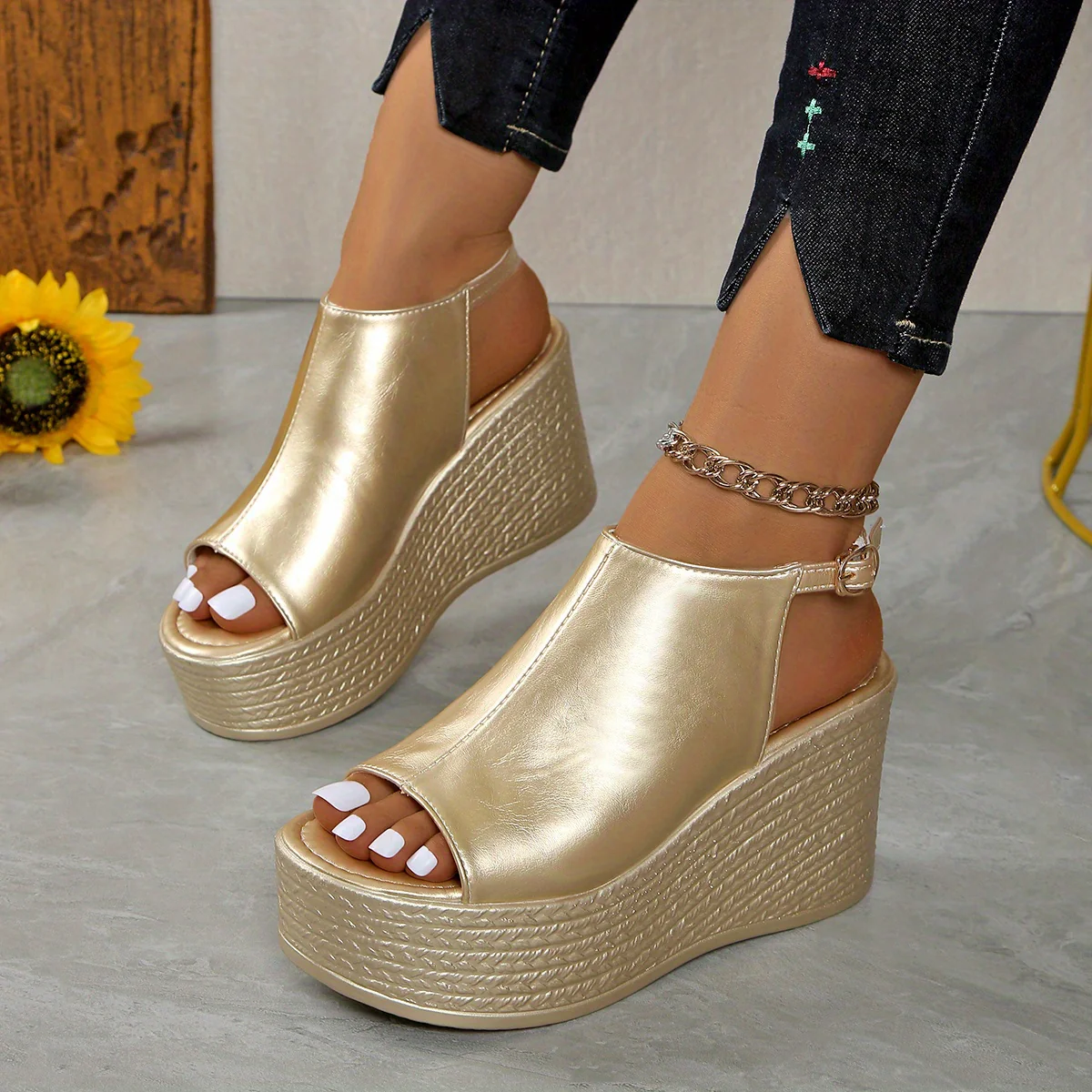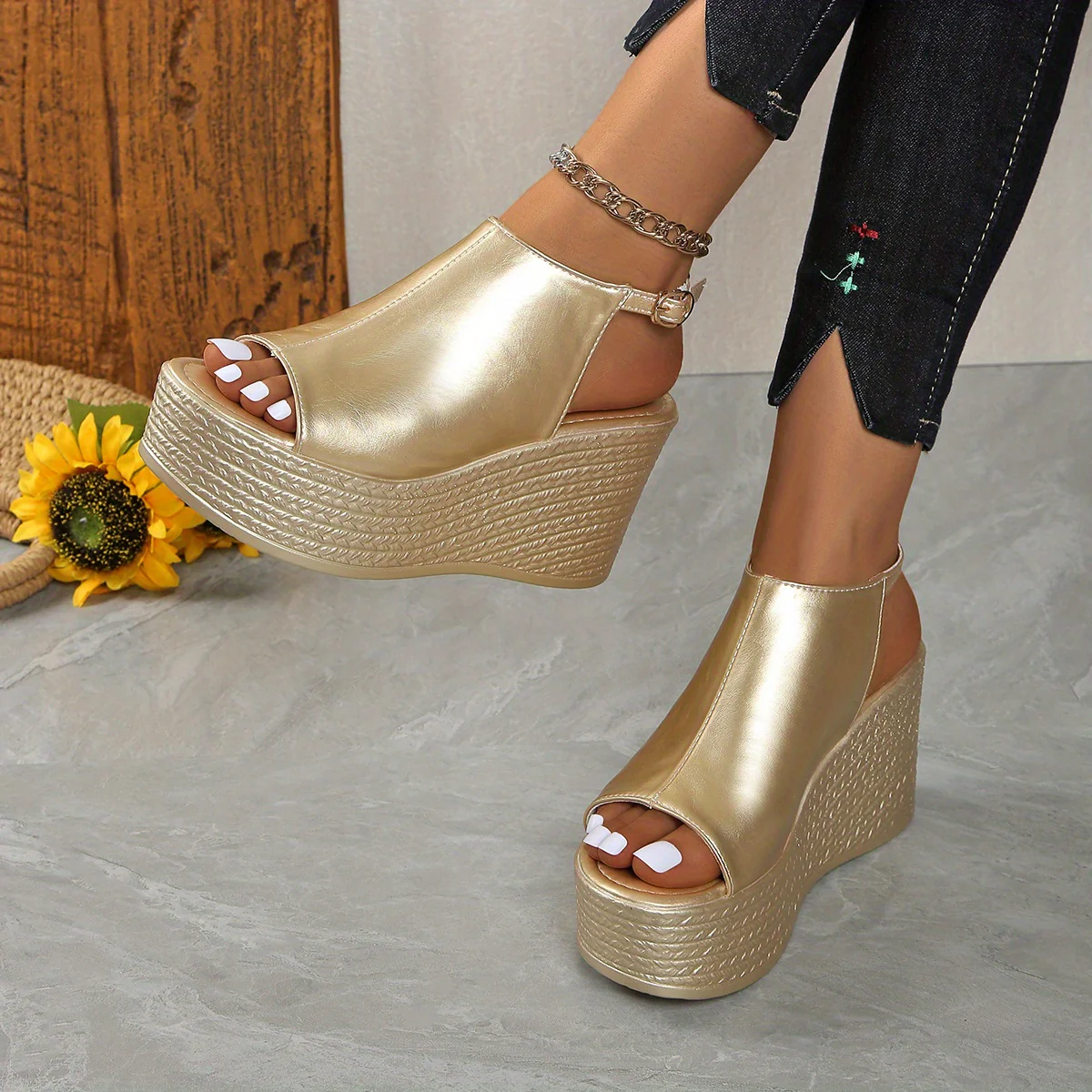Les Sandales compensées métallisées dorées pour femmes sont l’accessoire parfait pour celles qui souhaitent allier confort et élégance. Conçues avec des matériaux de haute qualité, ces sandales apportent non seulement une touche sophistiquée à votre tenue, mais elles assurent également un soutien optimal pour vos pieds. Que ce soit pour une soirée, une sortie en ville ou des événements spéciaux, ces sandales sont idéales pour n’importe quelle occasion.