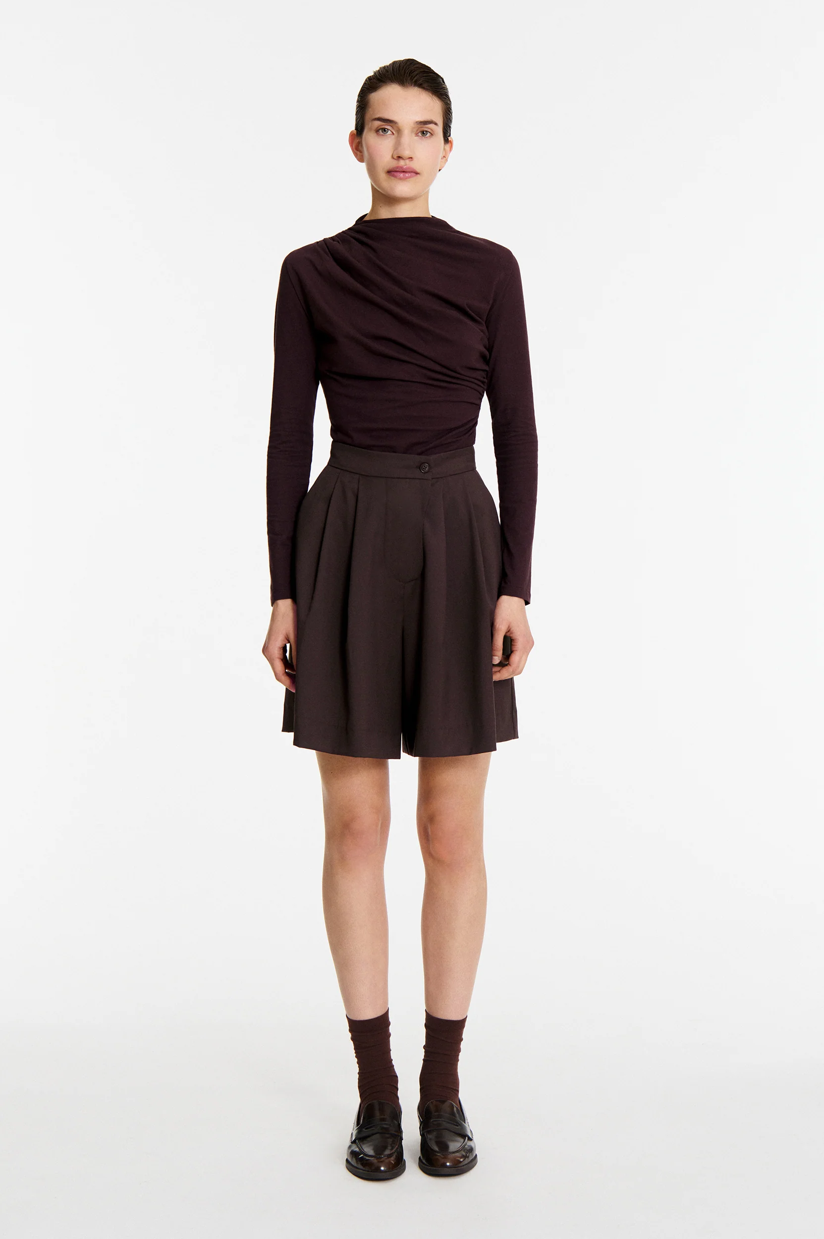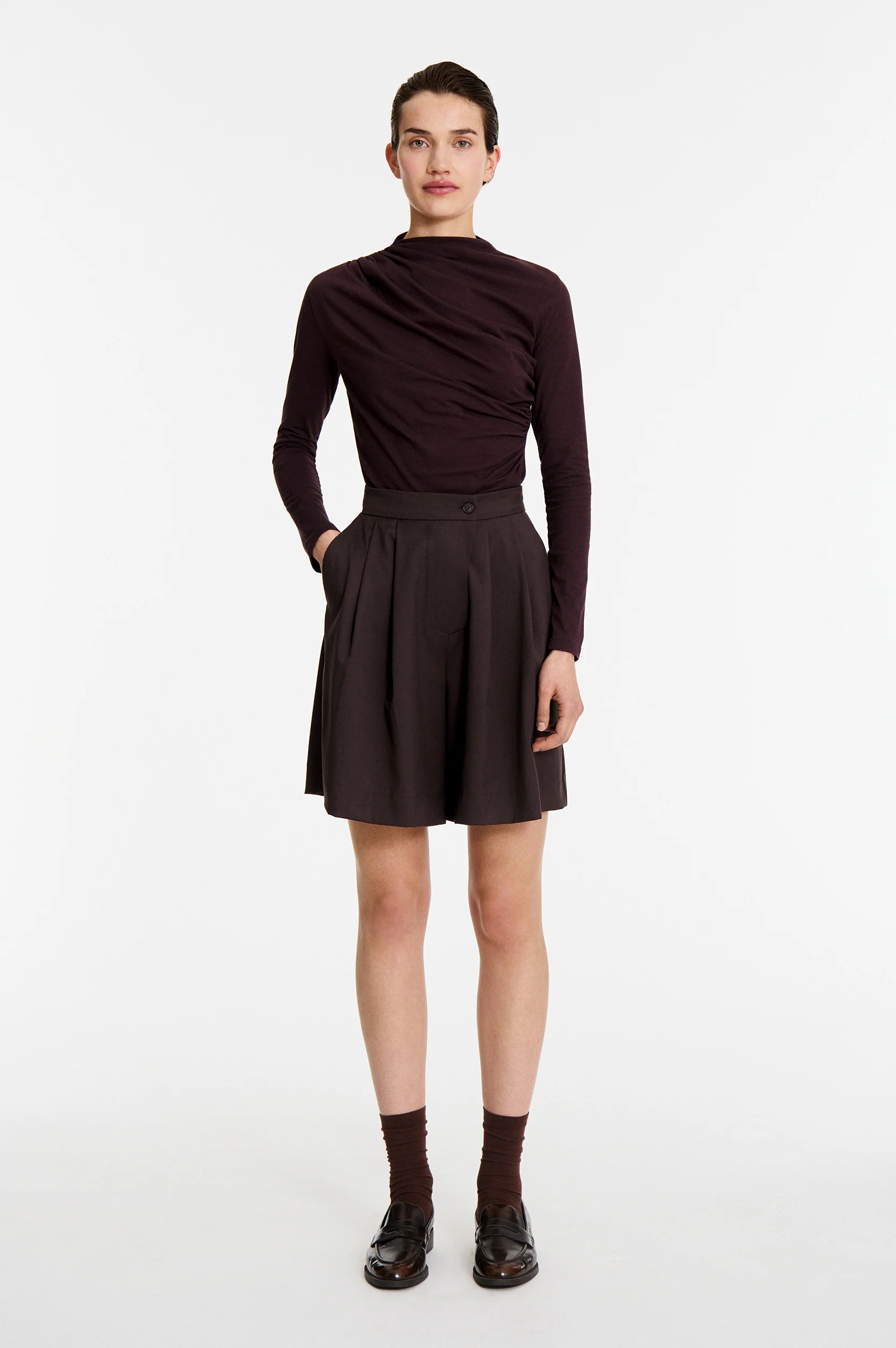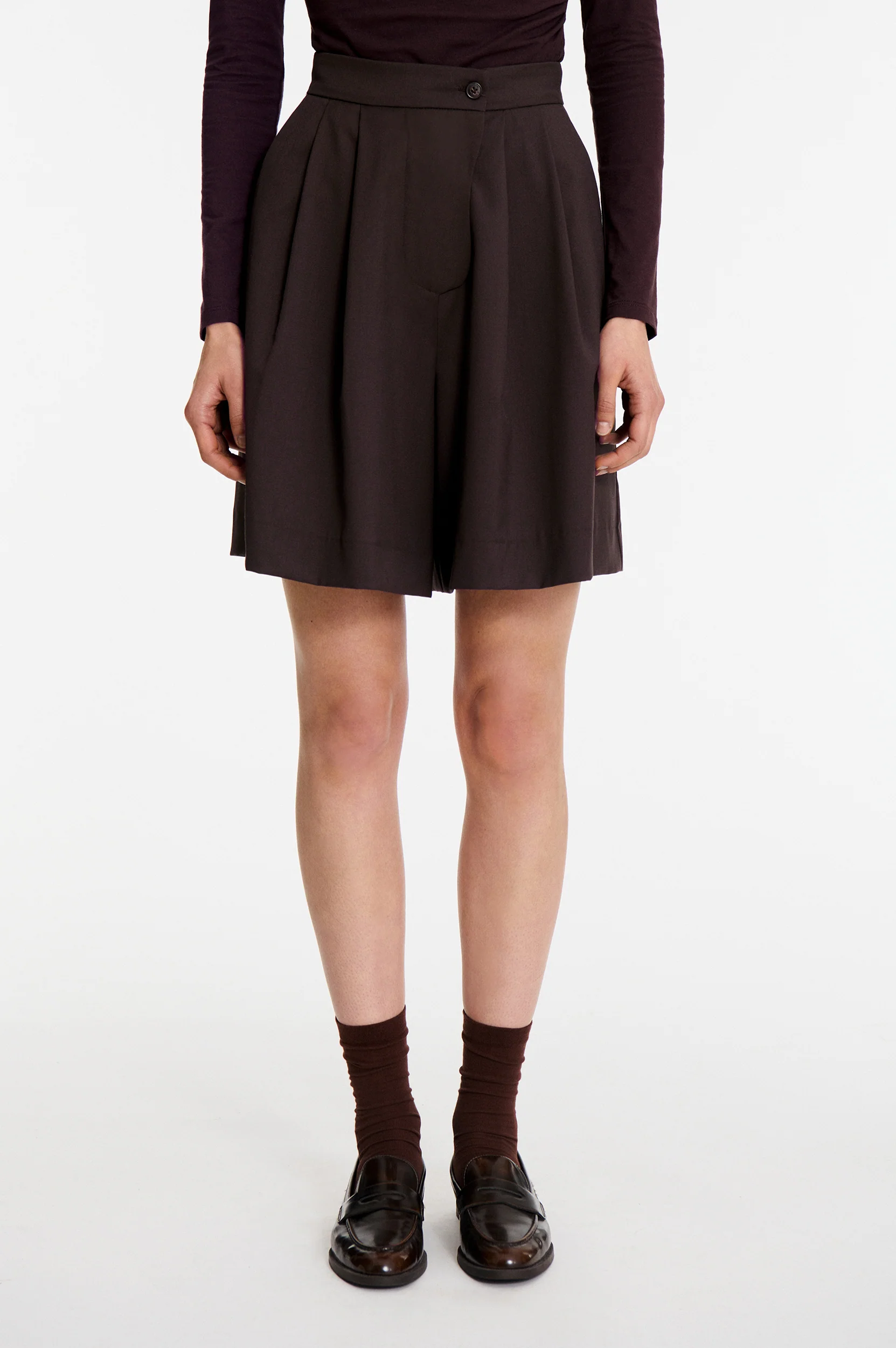 Short Siranush en laine Short bermuda large en laine légère Taille mi-haute avec passants de ceinture Coupe droite et ample 100% laine Le mannequin mesure 179 cm et porte une taille 36.