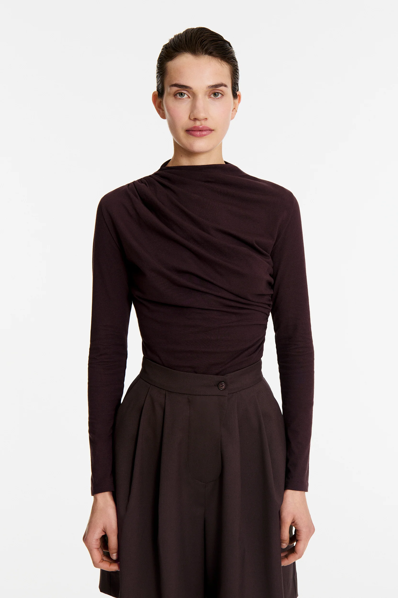 Le mannequin mesure 179 cm et porte une taille 36.