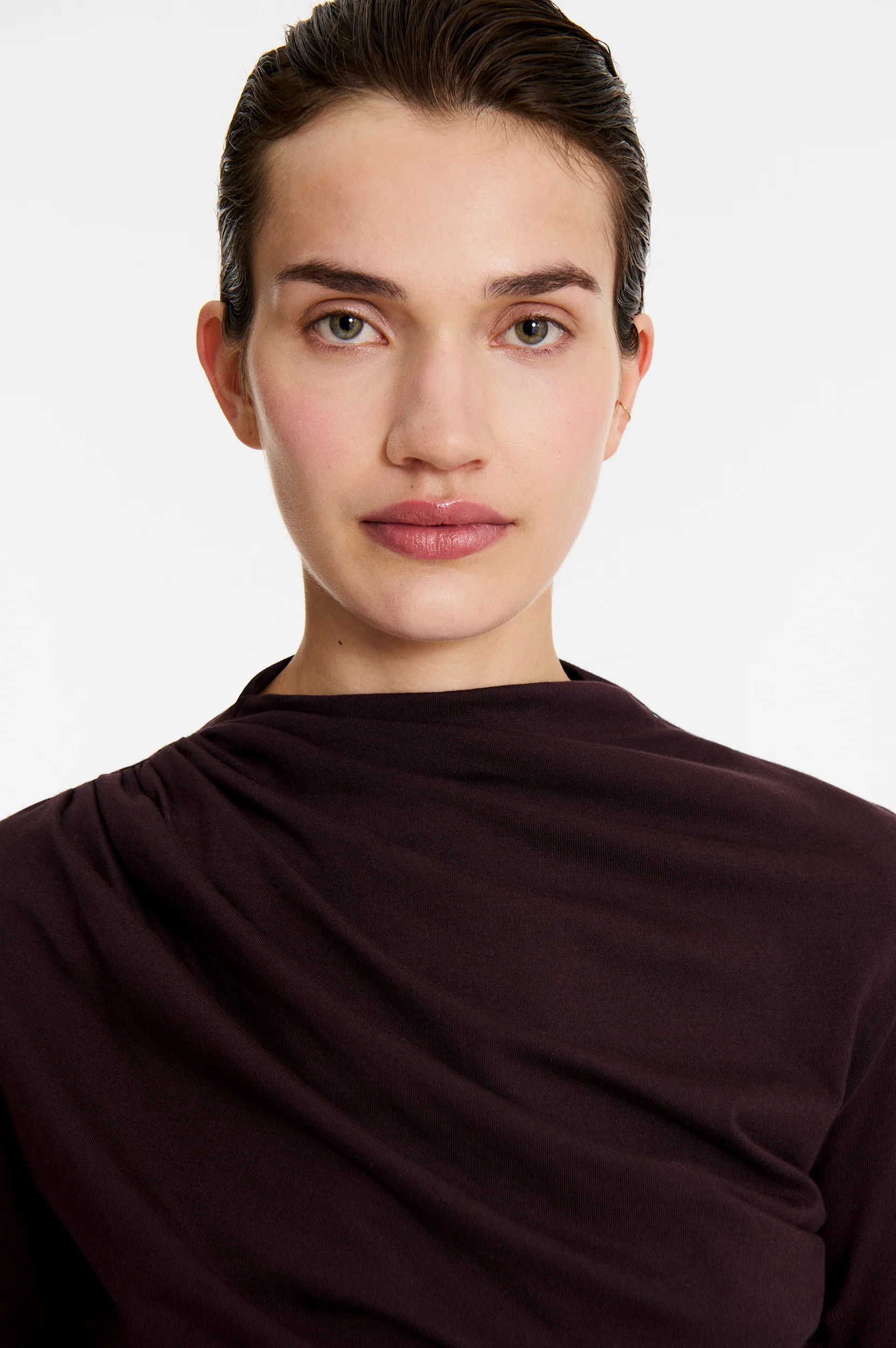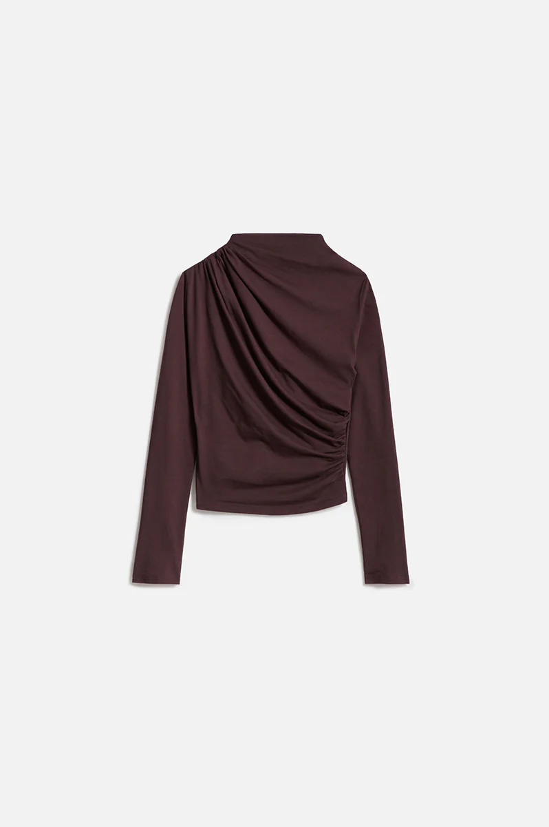 Top Arev en coton organique uni non doublé Coupe ajustée et légèrement stretch, épousant naturellement les courbes du corps Manches longues droites pour une ligne épurée Col montant agrémenté d’une ouverture zippée discrète sur l’épaule gauche Fronces diagonales asymétriques créant un effet drapé élégant et structurant Jersey 100 % coton organique, doux et non doublé […]
