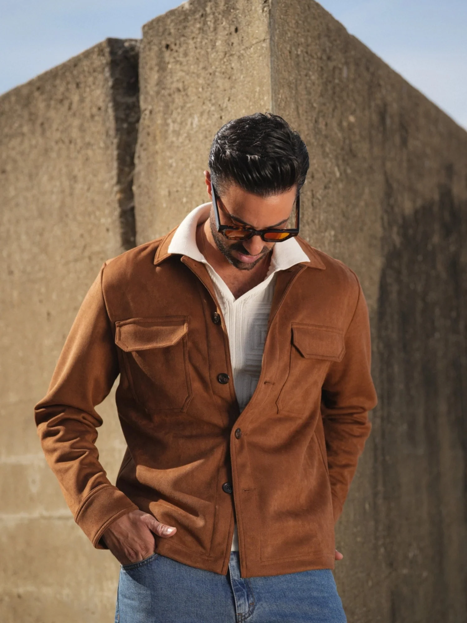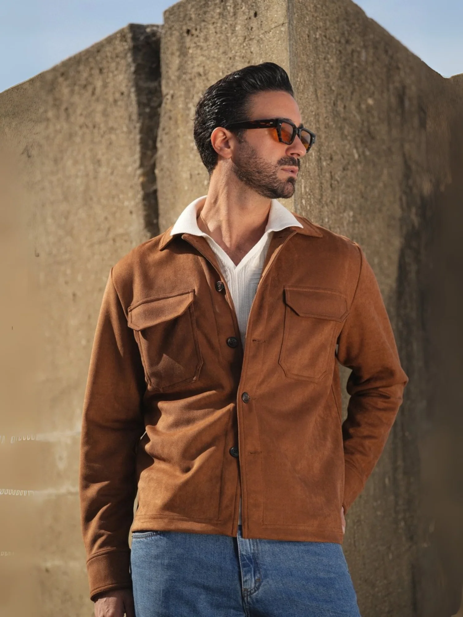 Veste Homme en Suède Camel – Chemise Overshirt Slim Fit de Luxe avec Détails de Poches