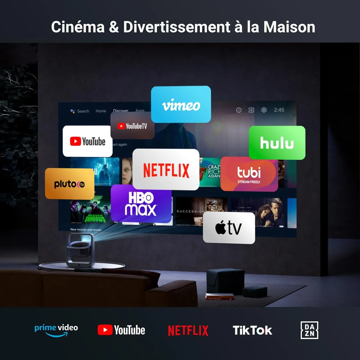 - 🎬 Vidéoprojecteur Intelligent pour Home Cinéma: Équipé d’Android 13.0, le vidéo projecteur portable Venus V1 est compatible avec des applications populaires telles que Netflix, Prime Video, DAZN et YouTube directement. Il offre une expérience de streaming fluide sans besoin d’appareils supplémentaires : un tout-en-un projecteur Smart TV pour un divertissement pur.